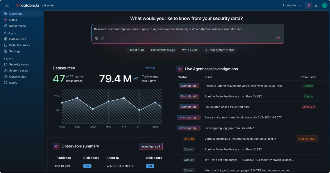 - Genie Spaces: 자연어 쿼리 인터페이스 및 에이전틱 하니스(harness)를 통해 모든 사용자가 복잡한 쿼리 언어를 배우지 않고도 복잡한 다단계 위협 헌팅을 수행할 수 있습니다.