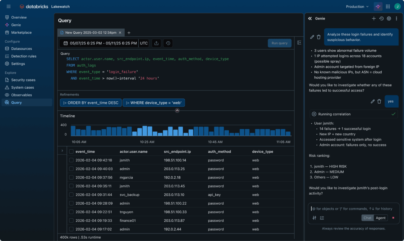 전통적인 SIEM은 데이터의 전체 컨텍스트에 접근할 수 없는 볼트온(bolt-on) AI 기능에 의존합니다. Lakewatch는 임베디드 AI를 보안 데이터가 실제로 존재하는 곳으로 직접 가져옵니다. Genie 는 새로운 로그 소스의 OCSF 파싱 및 수집, 최신 위협 인텔리전스에 기반한 신규 탐지 규칙 작성, 오탐(false positive)을 줄이기 위한 기존 규칙 수정, 자연어 질문의 SQL 쿼리 변환 등 중요한 워크플로우를 자동화합니다. Genie Spaces 는 보안 팀이 전문 쿼리 언어 대신 일반 영어로 페타바이트의 데이터를 쿼리할 수 있게 하여, 기술 수준에 관계없이 위협 헌팅을 민주화합니다.