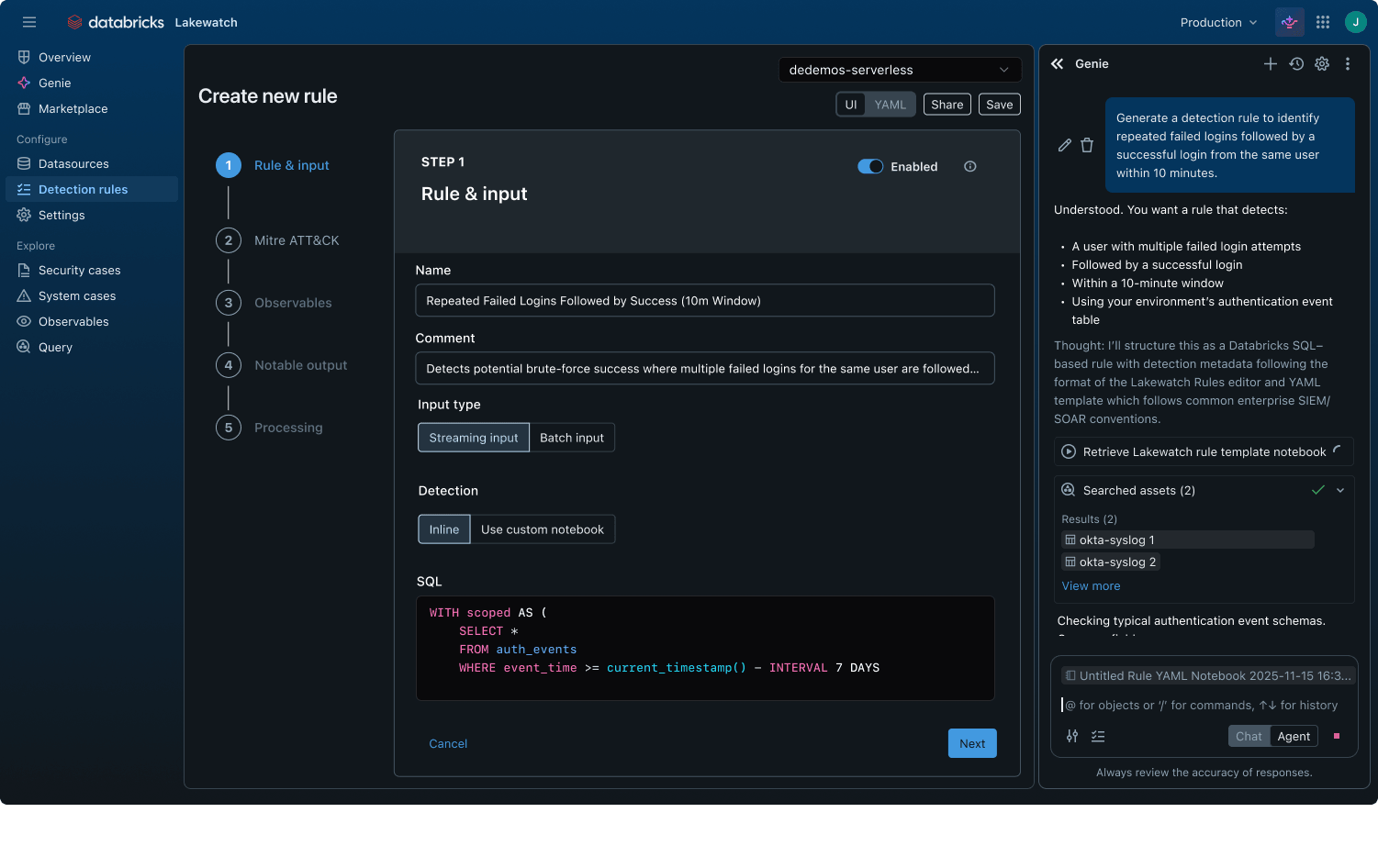 - Genie Code: AI 어시스턴트가 수집 자동화, 신규 탐지 규칙 작성, 오탐 감소를 위한 규칙 수정, 조사를 위한 자연어 질문의 SQL 쿼리 변환을 수행합니다.